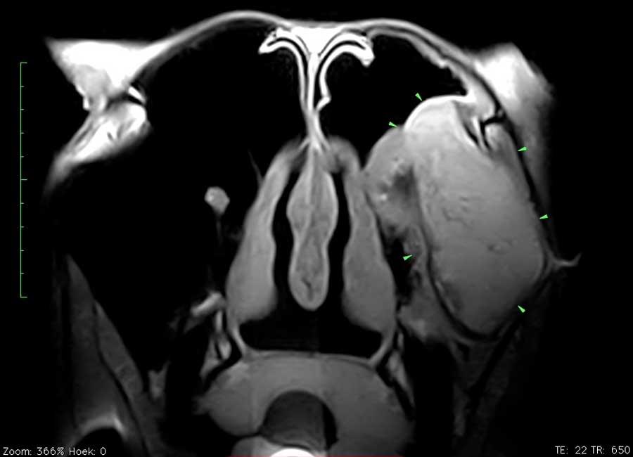 Dit paard had sinds enkele weken een unilaterale bloederige neusvloei. Op endoscopisch onderzoek was slechts een minimale afwijking ter hoogte van het linker ethmoid te zien. Radiografisch onderzoek toonde echter een grote massa in de sinus. Er werd beslist een pre-operatieve MRI uit te voeren om de operatie te plannen en ook de prognose beter te kunnen inschatten. Het ethmoid hematoom (PEH) bleek een groot deel van de linker sinus ingenomen te hebben.