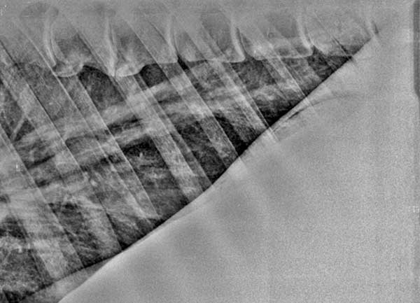 Röntgenfoto van longen van een paard met ernstige longproblemen: de luchtwegen zijn reeds "verlittekend".